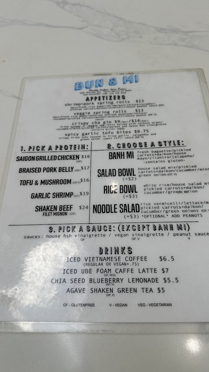 Bun & Mi, located at 1004 Montana Ave, Santa Monica, CA, offers a delightful fusion of Vietnamese-inspired dishes that are both fresh and flavorful. The menu is thoughtfully designed, with options ranging from appetizers to desserts, as well as a variety of beverages to complement every meal.